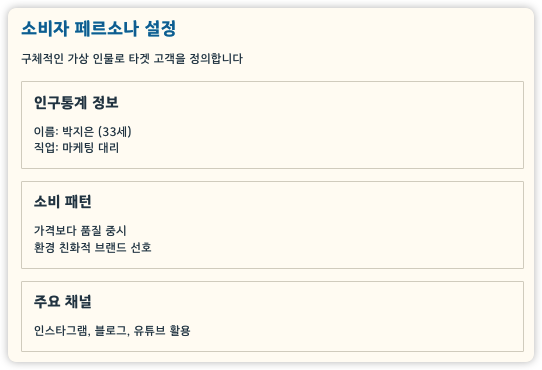 👉 이러한 구체적인 페르소나 설정을 통해 타겟 마케팅 전략을 세울 수 있습니다.