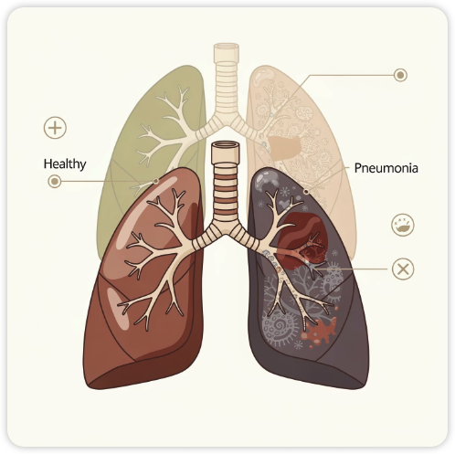 폐렴(Pneumonia)은 세균, 바이러스, 곰팡이 등의 감염으로 인해 폐에 염증이 생기는 질환입니다.