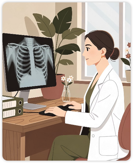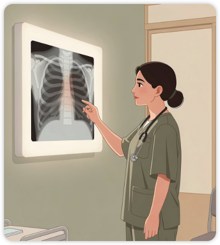 흉부 X-ray, 혈액검사, 객담(가래) 검사를 통해 염증의 위치와 원인을 확인합니다.