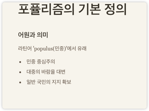 👉 이처럼 포퓰리즘은 이성보다 감성, 논리보다 상징에 의존하는 경향이 강합니다.