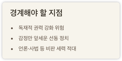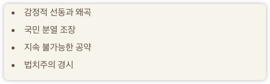 독재적 권력 강화, 선동 정치로 변질될 우려가 있습니다.