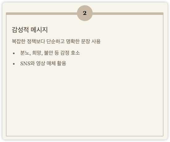 - 통계보다 감정적 호소(분노, 희망, 불안)를 활용