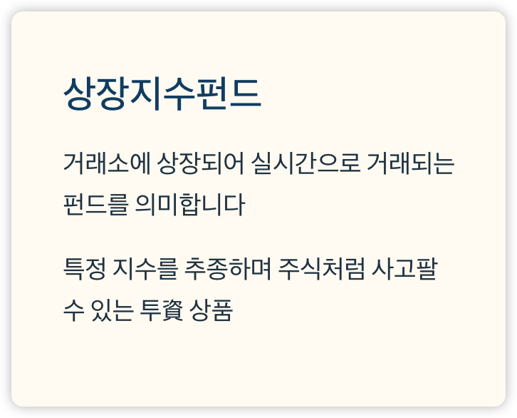 ETF는 특정 주가지수, 섹터, 자산군의 수익률을 따라가도록 설계된 펀드입니다.