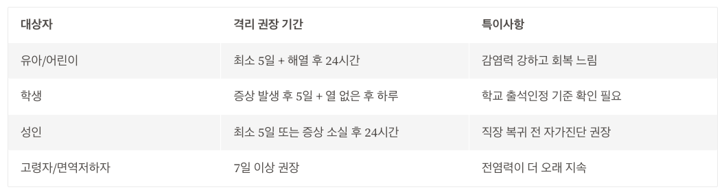 | 학생 | 증상 발생 후 5일 + 열 없은 후 하루 | 학교 출석 인정 기준 확인 필요 |