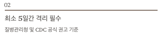 | 성인 | 최소 5일 또는 증상 소실 후 24시간 | 직장 복귀 전 자가진단 권장 |