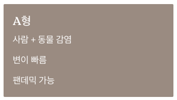 - A형 인플루엔자: 사람뿐 아니라 조류, 돼지 등 다양한 동물도 감염됨