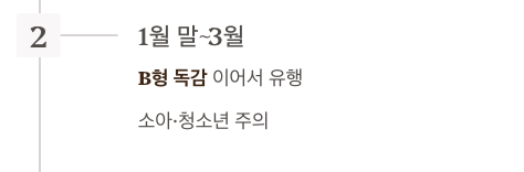 - B형 독감은 1월 말~3월까지 주로 나타나며 A형 이후에 이어지는 경향