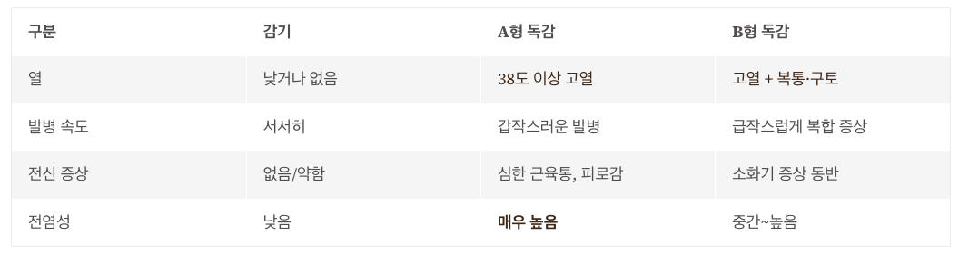 | 항목 | 감기 | A형 독감 | B형 독감 |